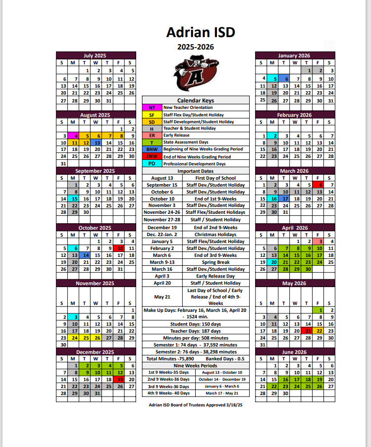 January 16, 2026Dear Parent/Guardian:Adrian ISD is sharing this information about the district and your child’s campus with you as part of its obligations under the federal Every Student Succeeds A...
